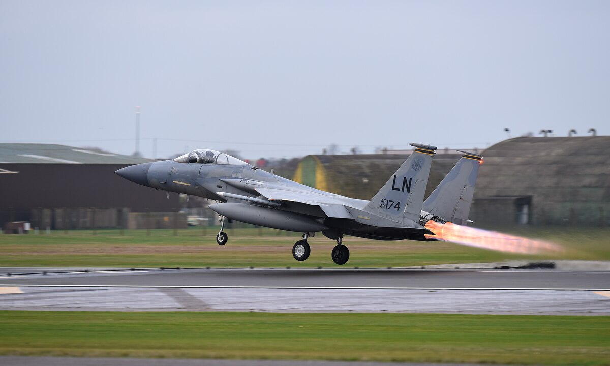An F-15E Strike Eagle assigned to the 492nd Fighter Squadron takes off for a sortie at Royal Air Force Lakenheath, England, Dec. 18, 2018. The F-15E Strike Eagle is a dual-role fighter designed to perform air-to-air and air-to-ground missions. An array of avionics and electronics systems gives the F-15E the capability to fight at low altitude, day or night, and in all weather. (U.S. Air Force photo by Senior Airman Malcolm Mayfield)