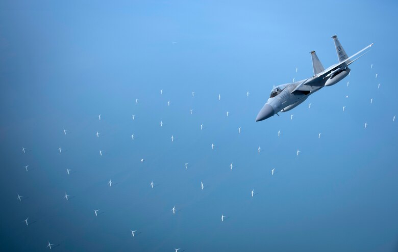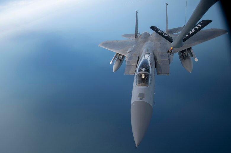 RAF Mildenhall, England -- The 100th Air Refueling Wing refueled F-15C Eagles and F-15E Strike Eagles from the 48th Fighter Wing, RAF Lakenheath, England, off the English coast, April 23, 2020. The 100th ARW is the only permanent U.S. air refueling wing in the European theater, providing the critical air refueling "bridge" which allows the Expeditionary Air Force to deploy around the globe at a moment's notice.