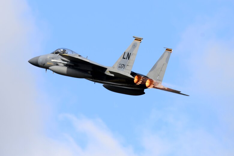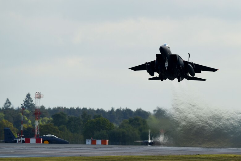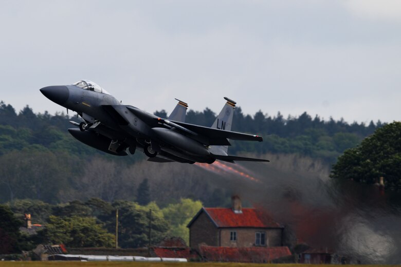 An F-15C Eagle assigned to the 493rd Fighter Squadron takes off from Royal Air Force Lakenheath, England, May 1, 2020. The 48th Fighter Wing continues flying operations to maintain trained and ready combat air forces in order to safeguard U.S. and allied national security interests, despite the current COVID-19 crisis. (U.S. Air Force photo by Senior Airman Christopher S. Sparks)