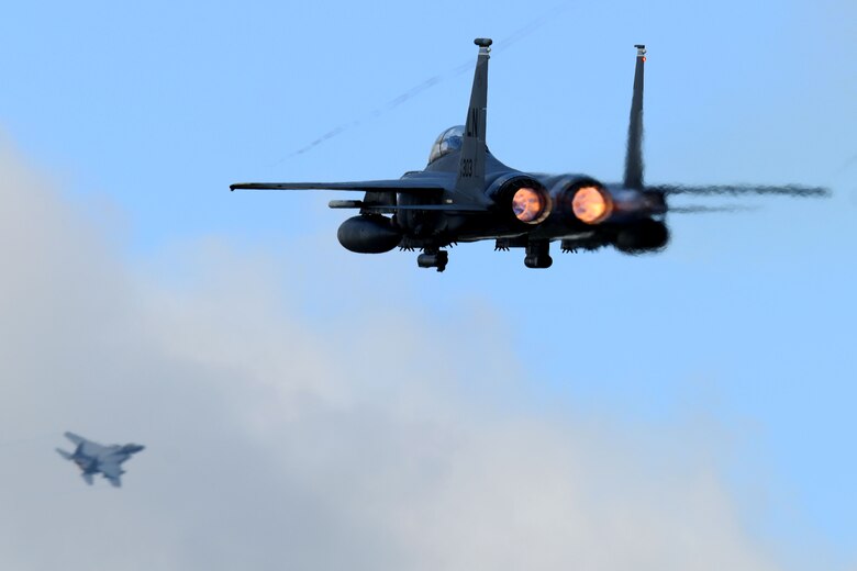 An F-15E Strike Eagle assigned to the 492nd Fighter Squadron takes off as two other F-15E Strike Eagles prepare to take off from Royal Air Force Lakenheath, England, May 1, 2020. The 48th Fighter Wing continues flying operations to maintain trained and ready combat air forces in order to safeguard U.S. and allied national security interests, despite the current COVID-19 crisis. (U.S. Air Force photo by Senior Airman Christopher S. Sparks)