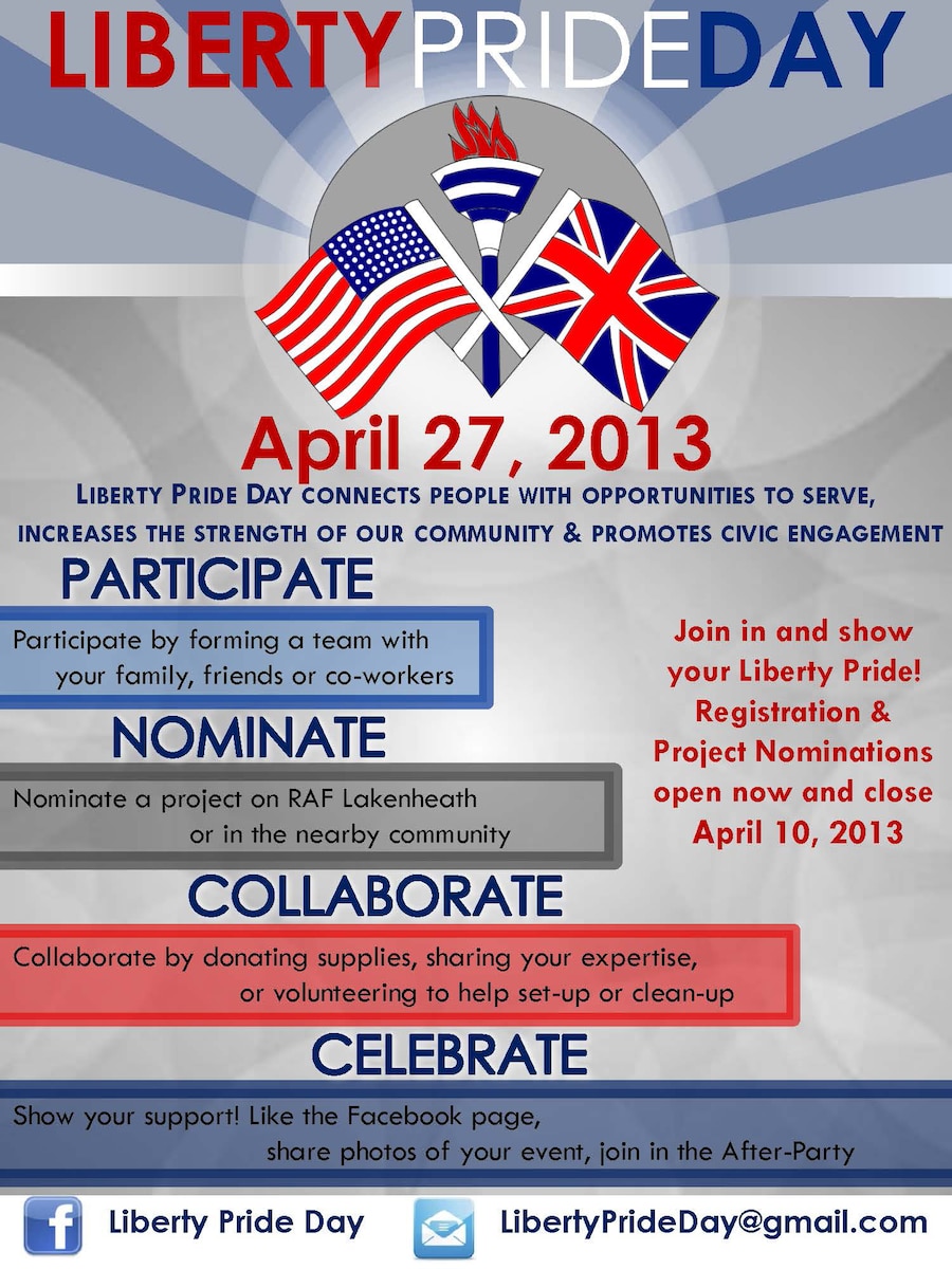 Liberty Pride Day sets stage for community improvement Published March 5, 2013 By Airman 1st Class Dana J. Butler 48th Fighter Wing Public Affairs ROYAL AIR FORCE LAKENHEATH, England -- The 48th Fighter Wing will host the first Liberty Pride Day on base and throughout the local area April 27. The intent of Liberty Pride Day is to make a difference in the community and to help bolster a sense of pride in the community both on and off base. To help out, Airmen should submit ideas that help improve the base and surrounding community. Airmen should then get a group together, pick a project and work to impact the lives of people within the RAF Lakenheath community in a new, creative and positive way. Members of the base community can submit ideas for improvement projects either on base or in the local area. The project could be as simple as picking up trash or as challenging as taking on an area in the dorms that needs paint or refurbishment work. "It doesn't necessarily have to be a physical fix-it project, for example, making cards for people who aren't well, visiting people in a nursing home or clothing donations," said Maureen Robinson, Liberty Pride Day advisor and wife of Col. Kyle Robinson, 48th FW commander. "One of the things you could do is just donate toward the dinner at the end of the day." Project ideas welcomed for submission must be completed in one day and are in RAFs Lakenheath, Feltwell or in the local community. "I think we would like to see some of the activities happen off base in the British community and show our British friends that we really care about living here and living with them," said Robinson. "We are also hoping that some of the British people that work here on base might also want to get involved in projects." According to Staff Sgt. Joel Martycz, 48th Component Maintenance Squadron electrical and environmental systems craftsman and Liberty Pride Day advisor, the day will give members a chance to show "pride" by giving back to the installation and community that supports RAFL, while giving every active duty, civilian, and dependent an equal share in the ownership and support of the wing. "On a personal level I'd like to see people come out and boost morale. It is also a way to make new friends and build camaraderie and self esteem," said Christy Rasmussen, 48th Medical Group administrative medical technician and Liberty Pride Day committee member. "For me it's more of the feel good aspect of it and in the mean time, you get to appreciate all the improvements that have been made." According to Rasmussen, Liberty Pride Day is unique in that fact that it is a large-scale day of giving back where an individual can submit his or her idea for a project, then get their friends, family, sports team, church group, club or shop together and see the project all the way through from start to finish in just one day. "I think people would be happy to put efforts toward something they believe in," said Rasmussen. To learn more about Liberty Pride Day or to submit project ideas, e-mail Libertyprideday@gmail.com.