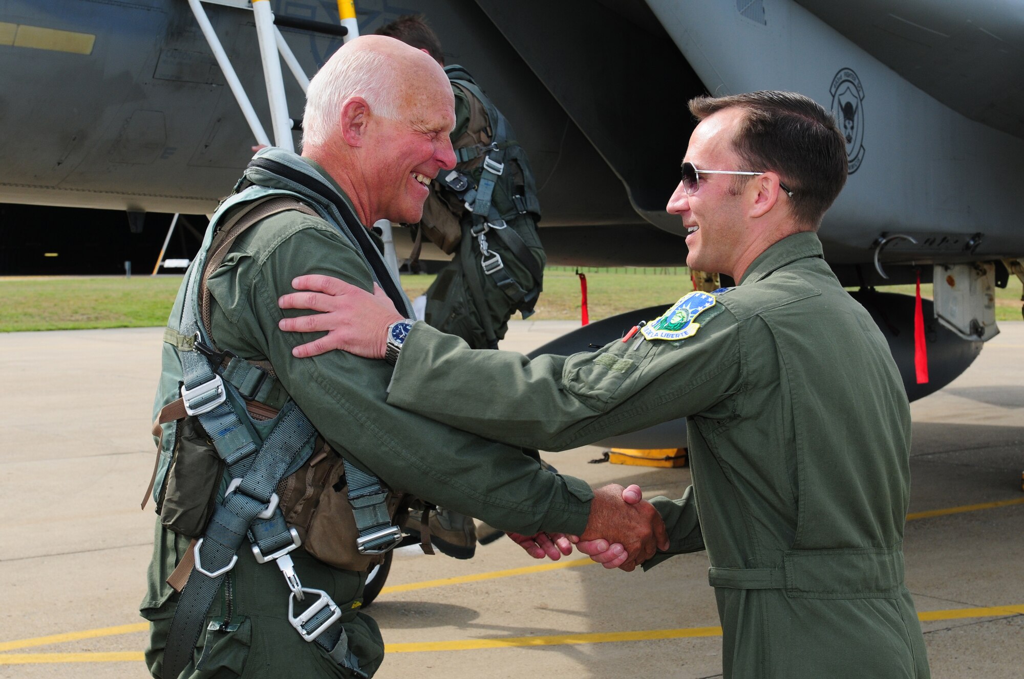 ROYAL AIR FORCE LAKENHEATH, England – John Cushing (left), 48th Fighter Wing honorary commander, greets Lt. Col. Mike Casey, 493rd Fighter Squadron commander, after an incentive flight in an F-15D Eagle Sept. 6, 2012. Cushing received an incentive flight with the 493rd FS to receive a better understanding of how the 48th FW operates. Cushing is the chairman of the British-American Committee, which ensures the local relationship between American and British remains intact and encourages integration of the two communities. (U.S. Air Force photo by Airman 1st Class Cory D. Payne)