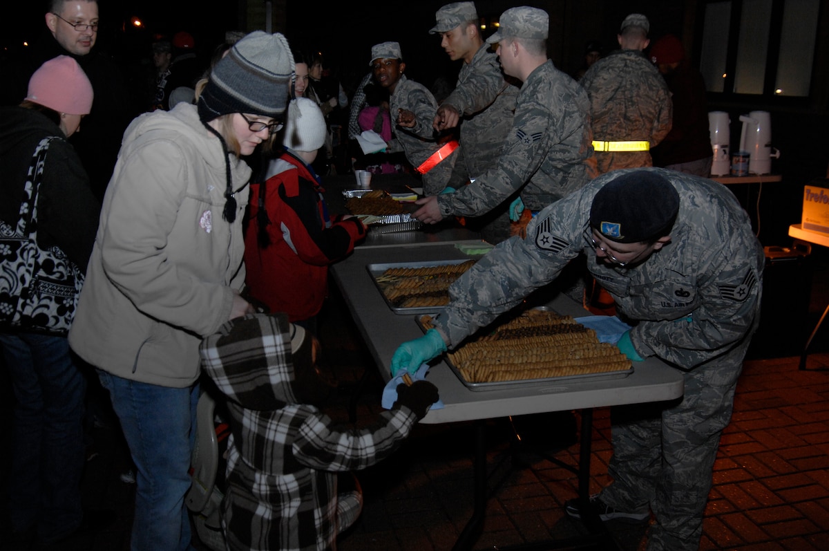 ROYAL AIR FORCE LAKENHEATH, England - Airmen hand out cookies at the 48th Fighter Wing Christmas tree lighting ceremony, Dec. 2, 2011. In addition to the cookies, the event featured caroling and a visit from Santa Claus. (U.S. Air Force photo by Staff Sgt. David Dobrydney)