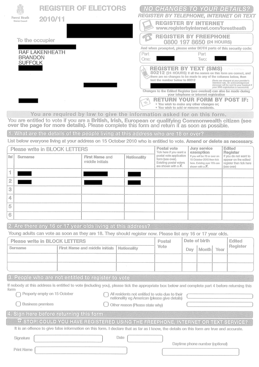 Base residents to receive UK Electoral survey Published Aug. 10, 2010 By Senior Airman David Dobrydney 48th Fighter Wing Public Affairs ROYAL AIR FORCE LAKENHEATH, England -- All households in the United Kingdom, including those of American personnel, will receive the annual Register of Electors in the coming days. All residents, living both on and off base, are legally required to complete and return the form. The register forms are expected to be mailed out during the second week of August through Royal Mail. The Register of Electors is also used to determine funding in local communities. "The response to Electoral Registration can impact on the figures used by local and national government when setting out funding," said Sdn. Ldr. Jerry Neild, Royal Air Force commander for RAF Lakenheath. "It's in our community's interest to give the maximum return possible." For households where there is no British citizen resident, the homeowner need only fill out Section 3 of the form, marking the box indicating "resident not entitled to vote" and writing "US" in the box on the right-hand side. The Register of Electors is compiled in October. If members are moving out before October 15, they must leave the form uncompleted for the next occupant. If there are British citizens age 16 or older living in the property, it is their information that must be filled in. Any dormitory residents with British nationality must contact Squadron Leader Neild's office, at DSN 226-1945, after August 16 to get the form. Whether in dormitories or housing, Squadron Leader Neild foresees few problems with the Register of Electors. "For most U.S. citizens it will take a minute to complete," he said. For more information about the Register of Electors, contact the Forest Heath District Council at 01638 719 364.