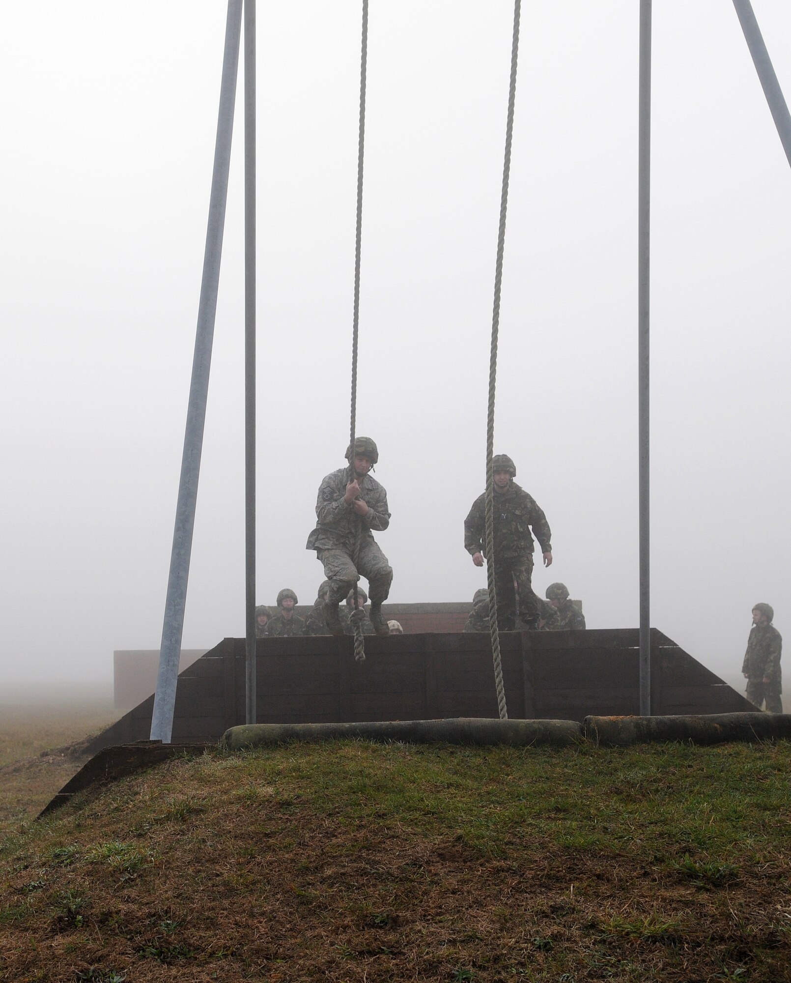 American, British forces join for leadership development Published Nov. 12, 2009 By Senior Airman Thomas Trower 100th Air Refueling Wing Public Affairs ROYAL AIR FORCE LAKENHEATH, England -- Airmen from RAFs Lakenheath and Mildenhall joined their British Royal Air Force counterparts to build cross-service relations and military skills during Leadership, Ethos and Air Power Day at RAF Marham Nov. 9. The program provides 275 hours of activity focused on developing physical and practical qualities in military servicemembers. The camp holds the event about three times a year, and 40 events were spread across the camp, said Flt. Lt. Timothy Serrell-Cooke, RAF Marham Force Development Flight officer-in-charge and event organizer. The participants are a mixture of all ranks, said Lieutenant Serrell-Cooke. LEAP Day provides an opportunity for Airmen to work together with others who they normally wouldn't. That ensures servicemembers can work together quickly in an emergency. Participants learn about other leadership styles and how they can best be applied, said Flt. Lt. Levi Birch, RAF Marham Force Development Flight officer in charge. The 40 U.S. Airmen were dispersed with RAF airmen into 55 groups, or modules. "LEAP day at RAF Marham was a great opportunity to work hand-in-hand with our RAF cousins and to experience the fundamentals and values they instill in their airmen," said Staff Sgt. Ronald Cooney, 100th Air Refueling Wing Air Force Smart Operations for the 21st Century office. "We can always grow from experiences outside of the norm, especially with a foreign service." "The most challenging event is the ropes course. It tests an individual's courage and committment to conquer their fears with the help of his or her team," said Lieutenant Birch. Staff Sgt. Samantha Webb, 48th Security Forces Squadron, traversed the high-ropes course amidst near freezing temperatures and a dense English fog. Several of the obstacles were about 50 feet high, and students were belayed for safety. "Although you can rely on the person holding your rope, it's all up to you," said Sergeant Webb. "I was really anxious to be a part of [LEAP Day]. Everyone needs to learn leadership and teamwork." Sergeant Webb said she plans on sharing the skills she learned with her co-workers. Sergeant Cooney said he now had a better understanding of the RAF. "Sometimes in the Air Force, we tend to get tunnel vision by concentrating on the day-to-day mission," he said. "It's quite interesting to see things from a slightly different perspective." "[The ropes course] looks high from the ground, but it looks much higher from the top," said Cpl. Simon Bradley, Module 52 leader. "This was great to learn and push through my fears. For myself, it was a good opportunity to lead and work with the [U.S. Air Force]." "Together we can develop a better understanding of each other," said Lieutenant Serrell-Cooke. "We can apply these skills in an austere environment. In operations in, Afghanistan we work hand-in-glove." He continued to say a strong understanding of each nation's military can help the whole team work better together.