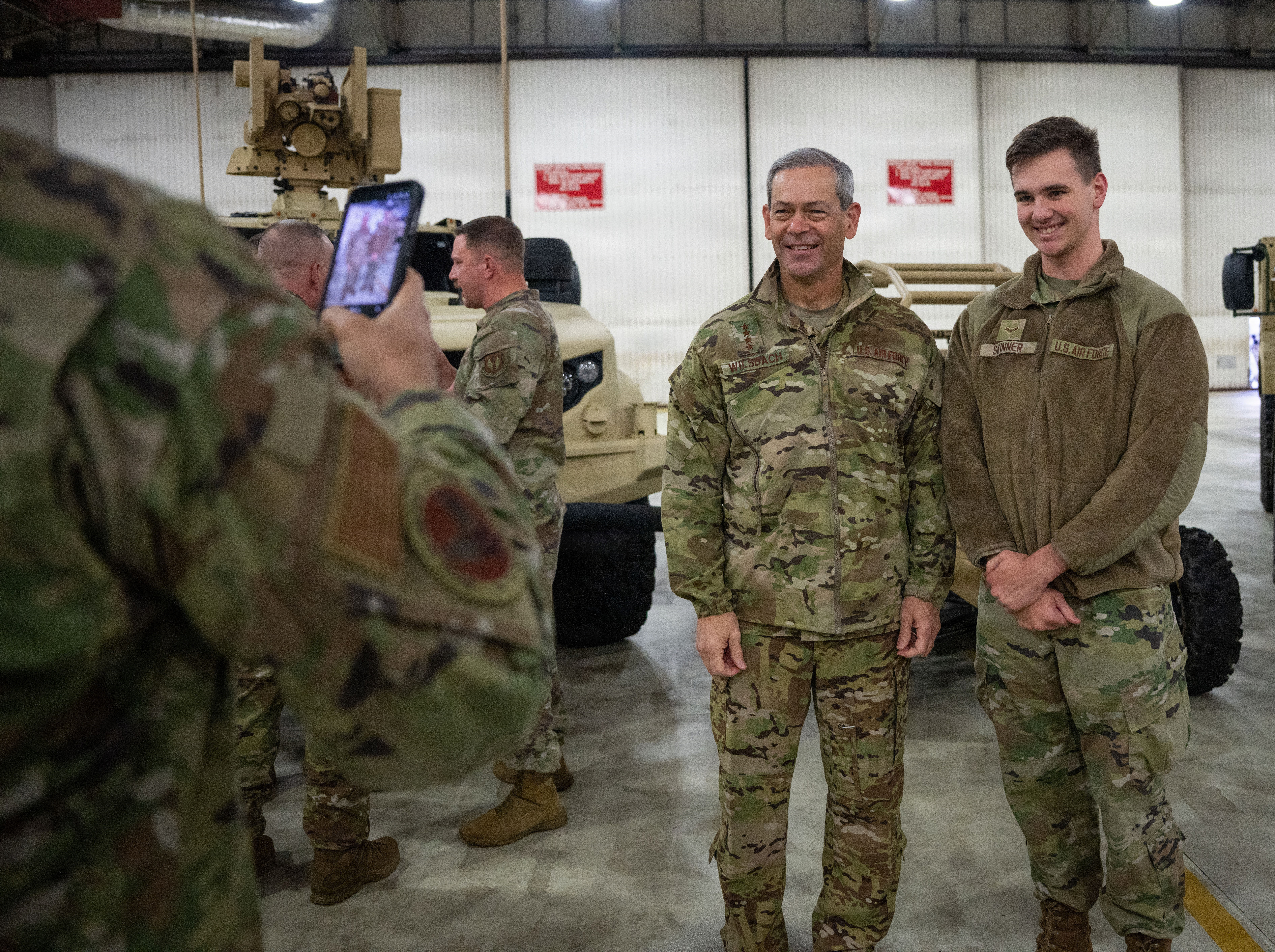 CSAF, CMSAF visit 48 FW, highlight mission priorities Published Dec. 20, 2025 By Staff Sgt. Elizabeth Davis 438th Fighter Wing ROYAL AIR FORCE LAKENHEATH, England -- Air Force Chief of Staff Gen. Ken Wilsbach, his wife, Mrs. Cindy Wilsbach, Chief Master Sergeant of the Air Force David Wolfe, and his wife, Dr. Doniel Wolfe, visited the 48th Fighter Wing Dec. 19. This visit kicked off a seven-base tour to meet with Airmen around the U.S. European Command and U.S. Central Command area of responsibility who stand watch 365 days a year. Air Force Chief of Staff Gen. Ken Wilsbach addresses a crowd of 48th Fighter Wing Airmen during a visit to RAF Lakenheath, England, Dec. 19, 2025. Wilsbach emphasized the Air Force’s crucial role in the European theater and how its forward presence helps protect the U.S. homeland. (U.S. Air Force photo by Airman 1st Class Sierra Casteel) Photo Details / Download Hi-Res “We know many of you are away from your families and friends this holiday season, and we wish you well and thank you for what you do,” said Wilsbach. The CSAF and CMSAF held an all-call to emphasize that in every career field readiness, modernization and innovation all play key roles in flying and fixing to deter any adversary. It’s the job of every leader in this room, which means every person in this room, to convince those around you that what we do is important,” said Wolfe. Wilsbach and Wolfe immersed themselves in several of the Liberty Wing’s key mission areas to include weapons, security forces, airfield operations and command post. The mission briefs and tours demonstrated how the Liberty Wing utilizes the strengths of nearly 7,000 active-duty and British and U.S. civilian personnel across RAF Lakenheath and RAF Feltwell. As the largest U.S. fighter operation in Europe, the wing employs four combat-ready fighter squadrons of F-15E Strike Eagles and F-35A Lightning II aircraft. Air Force Chief of Staff Gen. Ken Wilsbach poses for a photo with U.S. Air Force Airman 1st Class James Skinner, 48th Operations Support Squadron airfield management apprentice, during a visit to RAF Lakenheath, England, Dec. 19, 2025. Wilsbach emphasized the Air Force’s crucial role in the European theater and how its forward presence helps protect the U.S. homeland. (U.S. Air Force photo by Senior Airman Delanie Brown) Photo Details / Download Hi-Res During the visit, the Key Support Liaisons also dedicated time to meet with the 48th Medical Group, base community center, child development center and more, reinforcing leadership’s charge to ensure we are taking care of our wingmen left and right. “What I’d like for you to do,” said Wolfe, “is think about somebody you know that needs some help… and in the next couple of days, go help them.” Before departing, the CSAF left Liberty Wing Airmen with one final message. “What we do is hard, and doing hard things together builds strong teams. Everyone in this room is part of a winning team and has a connection to flying and fixing, no matter your job.” Chief of Staff of the Air Force Gen. Ken Wilsbach