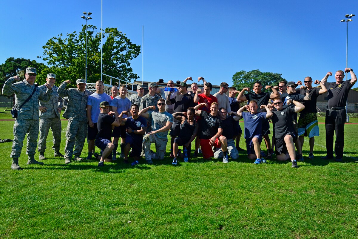 Bro, do you even gym? First responders battle it out Published Sept. 14, 2015 By Airman 1st Class Erin R. Babis 48th Fighter Wing Public Affairs ROYAL AIR FORCE LAKENHEATH, England -- Firefighters and security forces from Royal Air Forces Lakenheath and Mildenhall competed in the second annual Battle of the Badges, Sept. 10, to remember and commemorate first responders who came together during the 9/11 attacks."Once the first tower was hit, it didn't matter who was on the ground," said Tech. Sgt. John Shearer, 48th Security Forces Squadron NCO in charge of physical security. "Cops were helping firefighters, firefighters were helping EMTs and EMTs were helping cops. Everybody came together as one."Four events were organized to test the strength, endurance and agility of the teams. The morning started with lifting, followed by kickball and a zany game of Zorb soccer, a game where every player is in a giant bubble. The culminating event of the day was the relay course."The obstacle course definitely was my favorite part," said Senior Airman Jacob Swisher, 48th SFS criminal investigator. "We all had to finish as a team. There were times I was like, 'I just want to take this [gas mask] off,' but I couldn't. It was a lot of fun, and a good learning experience being with my brothers out there and kicking butt."The competition helped challenge the abilities of the bases' first responders. Shearer explained that, as first responders, they are held to a higher standard and, not only did they get to have fun and show off during the first few events, but the relay forced them to work as a team and build each other up to cross the finish line together."Iron sharpens iron," said Master Sgt. Jason Ramirez, 100th Civil Engineer Squadron chief of operations. "We push each other to get up to that next level. We want to always have excellence in all we do, and doing these types of events allows us to flourish."The day after the event, on the anniversary of 9/11, the two teams came together for a cookout and to award the trophy belts to RAF Lakenheath's reigning champions."What sums this up is teamwork and comradery," Ramirez said. "As first responders, for us, it's doing our jobs and doing them well, putting in the hard work to unite our forces together to celebrate and remember the loss of 9/11."