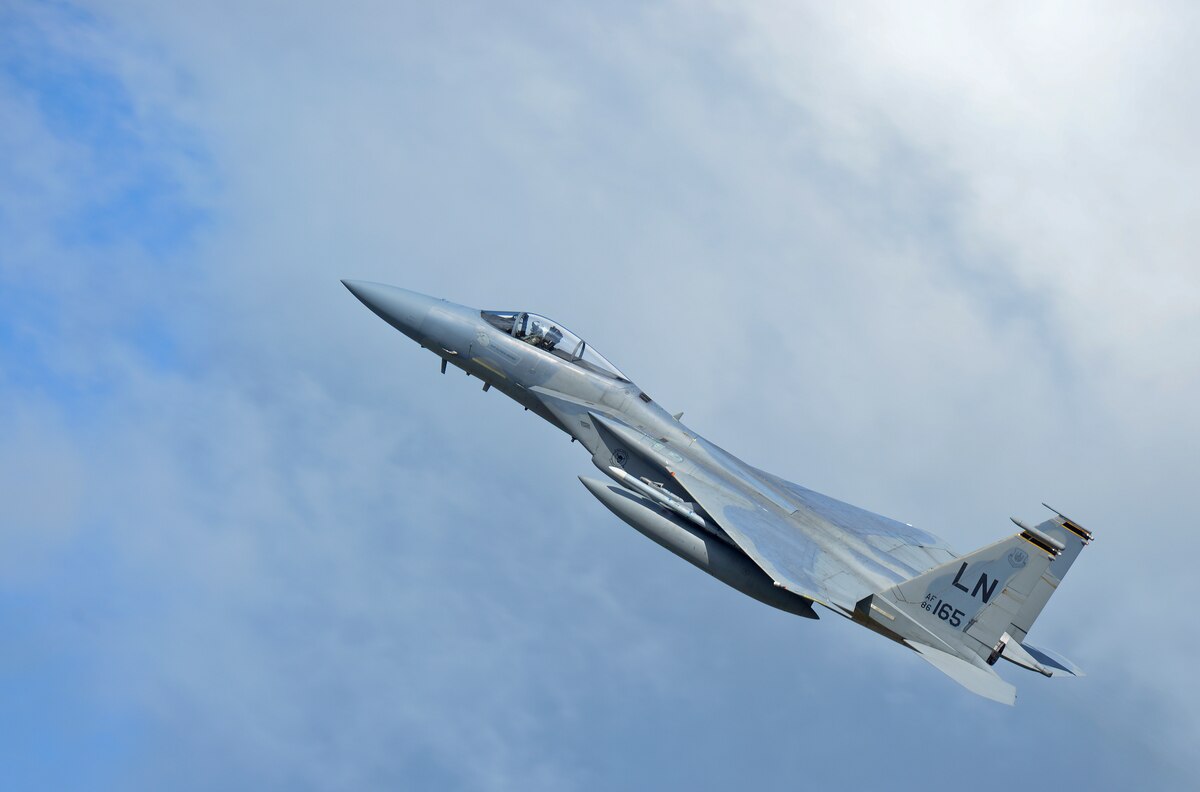 An F-15E Strike Eagle, assigned to the 48th Fighter Wing, flies over Royal Air Force Lakenheath, England, during a training sortie, Aug. 17, 2015. The 48th FW is responsible for providing air combat superiority for United States Air Forces in Europe area of responsibility. (U.S. Air Force photo by Senior Airman Trevor T. McBride/Released)
