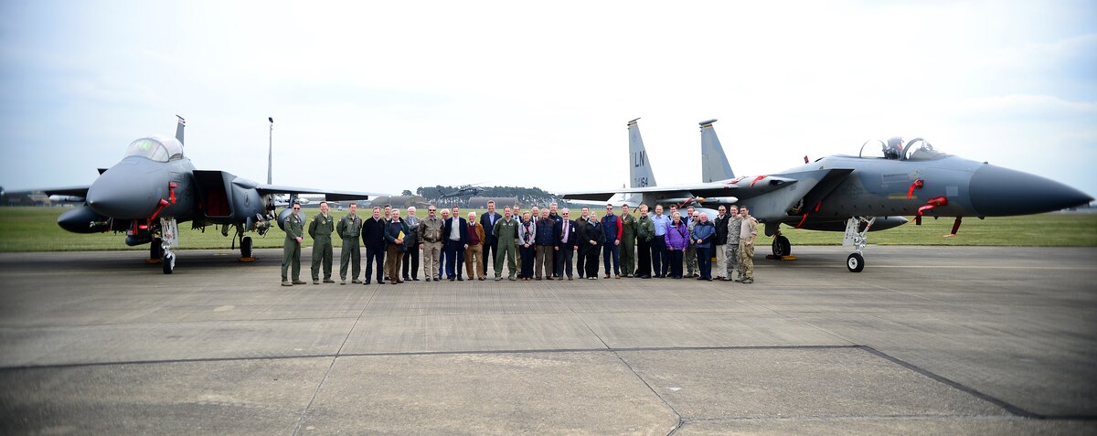 Honorary commanders pose for a group photo during their visit to Royal Air Force Lakenheath, England, April 17, 2014. Honorary commander visits are an outreach effort to help local leaders understand the base’s mission and roles. (U.S. Air Force photo by Staff Sgt. Emerson Nuñez/Released)