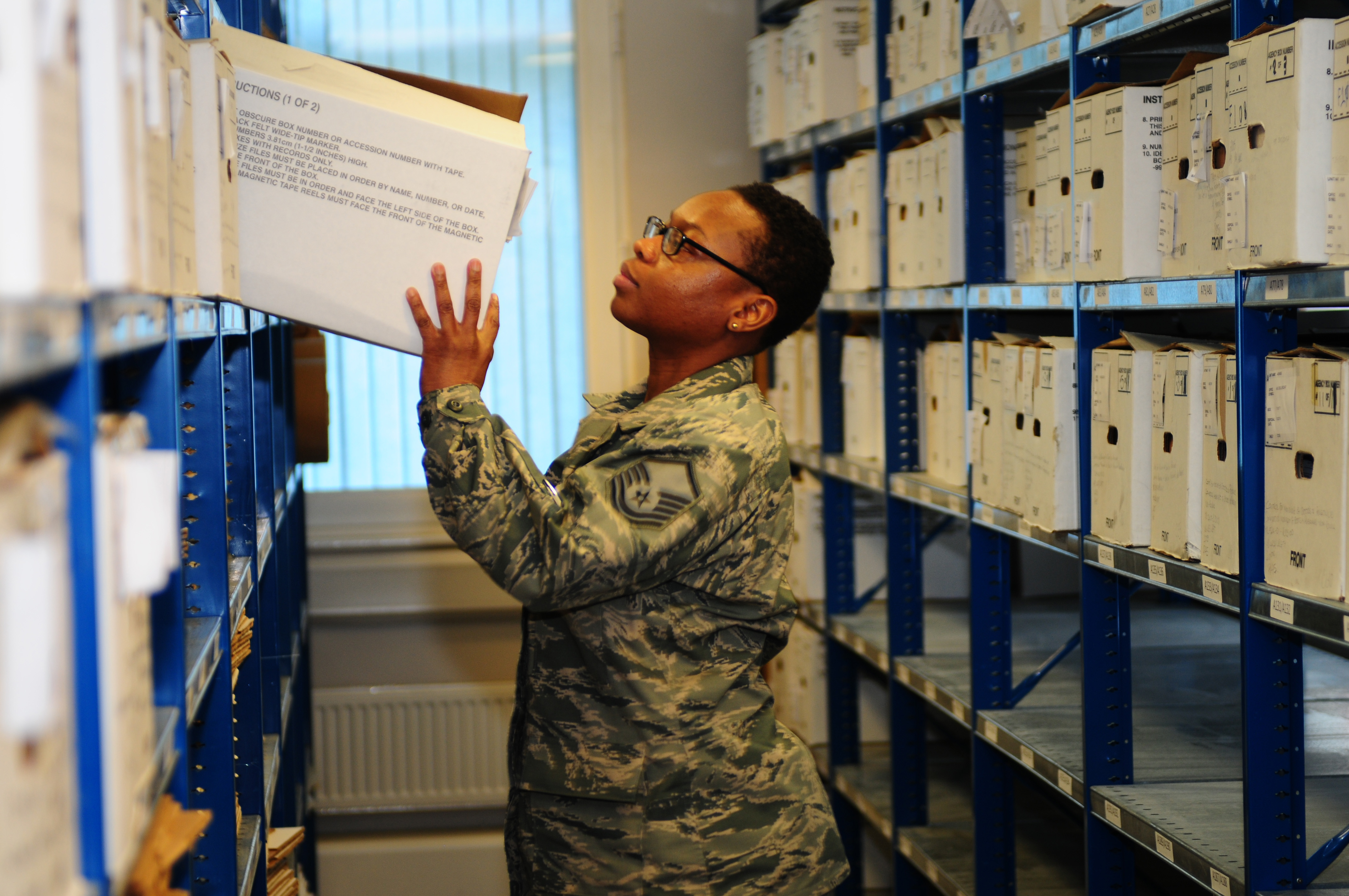 ROYAL AIR FORCE LAKENHEATH, England -- Master Sgt. Kenyu Barnes, 48th Communication Squadron superintendent of knowledge operations, looks for records in the new records housing location in the 48th CS building Jan. 16, 2013. The 48th Fighter Wing recently relocated records from building 1294 to the 48th CS building. (U.S. Air Force photo by Airman 1st Class Dana Butler)