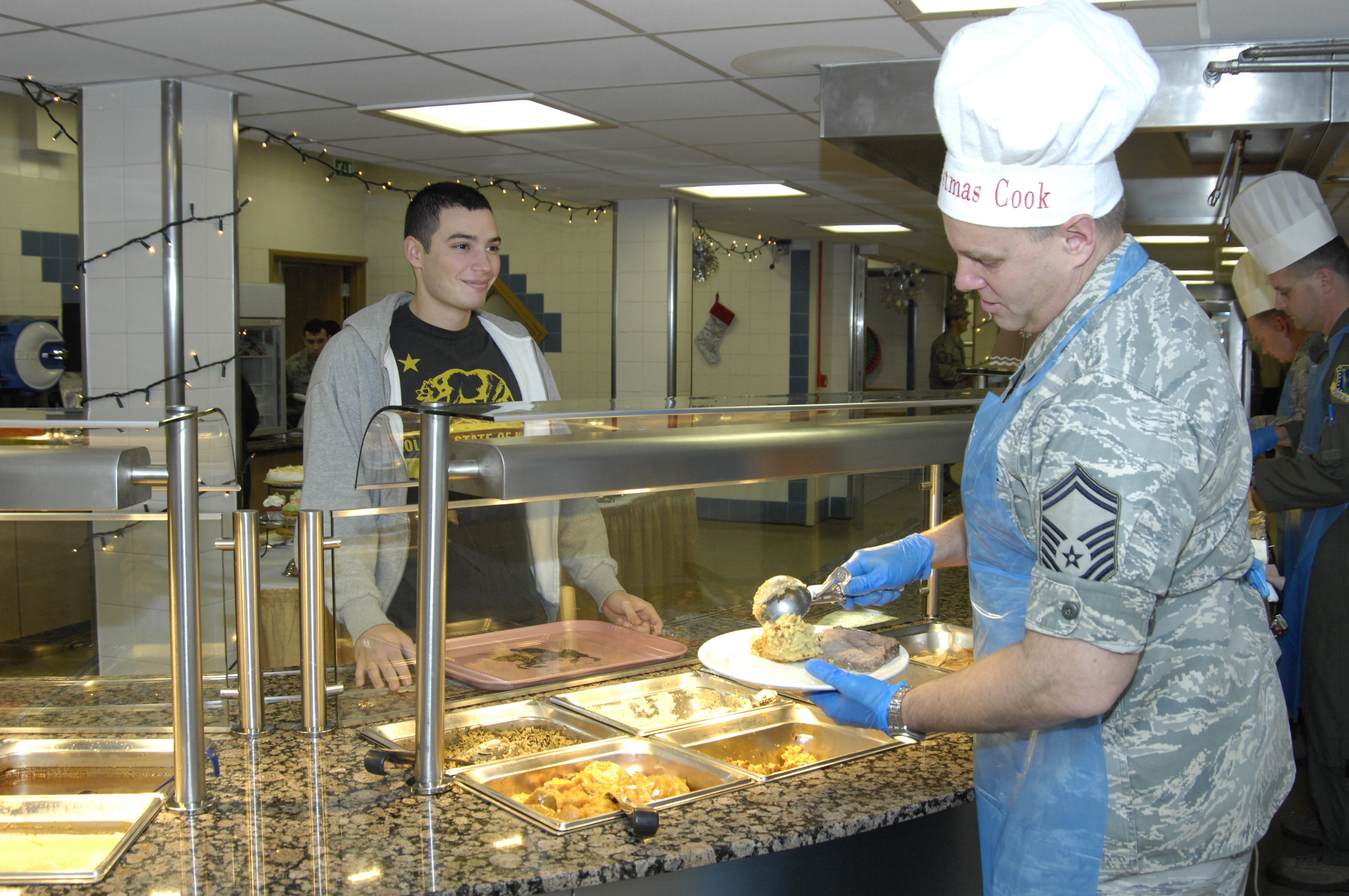 ROYAL AIR FORCE LAKENHEATH, England - Senior Master Sgt. Randall Knoblauch, 48th Medical Surgical Squadron surgical operations superintendent, serves up a holiday meal to Senior Airman Ian Fischer, 48th Communications Squadron cyber transport technician, Dec. 25, 2011. Base leadership officials volunteered at the Knight's Table Military Dining Facility to serve a holiday meal to Airmen, civilians and families. (U.S. Air Force photo by Airman 1st Class Erin Mills)