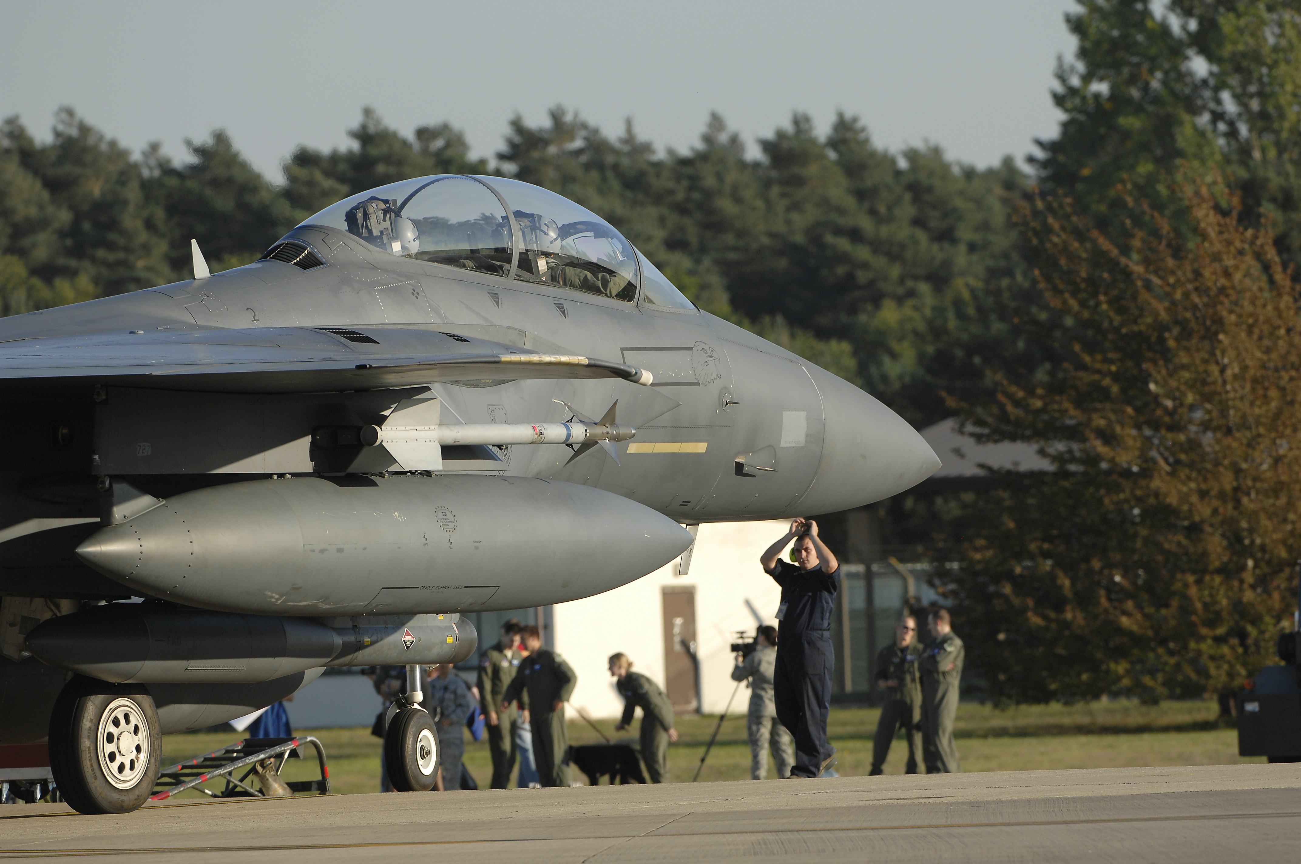ROYAL AIR FORCE LAKENHEATH, England - An F-15E Strike Eagle prepares to shut down after a deployment Sept. 30, 2011. Members of the 48th Fighter Wing and families greeted Airmen of the 494th Fighter Squadron who returned from deployment to Kunsan Air Base, South Korea where they supported the 8th FW's mission. (U.S. photo by Tech. Sgt. Lee A. Osberry Jr.)