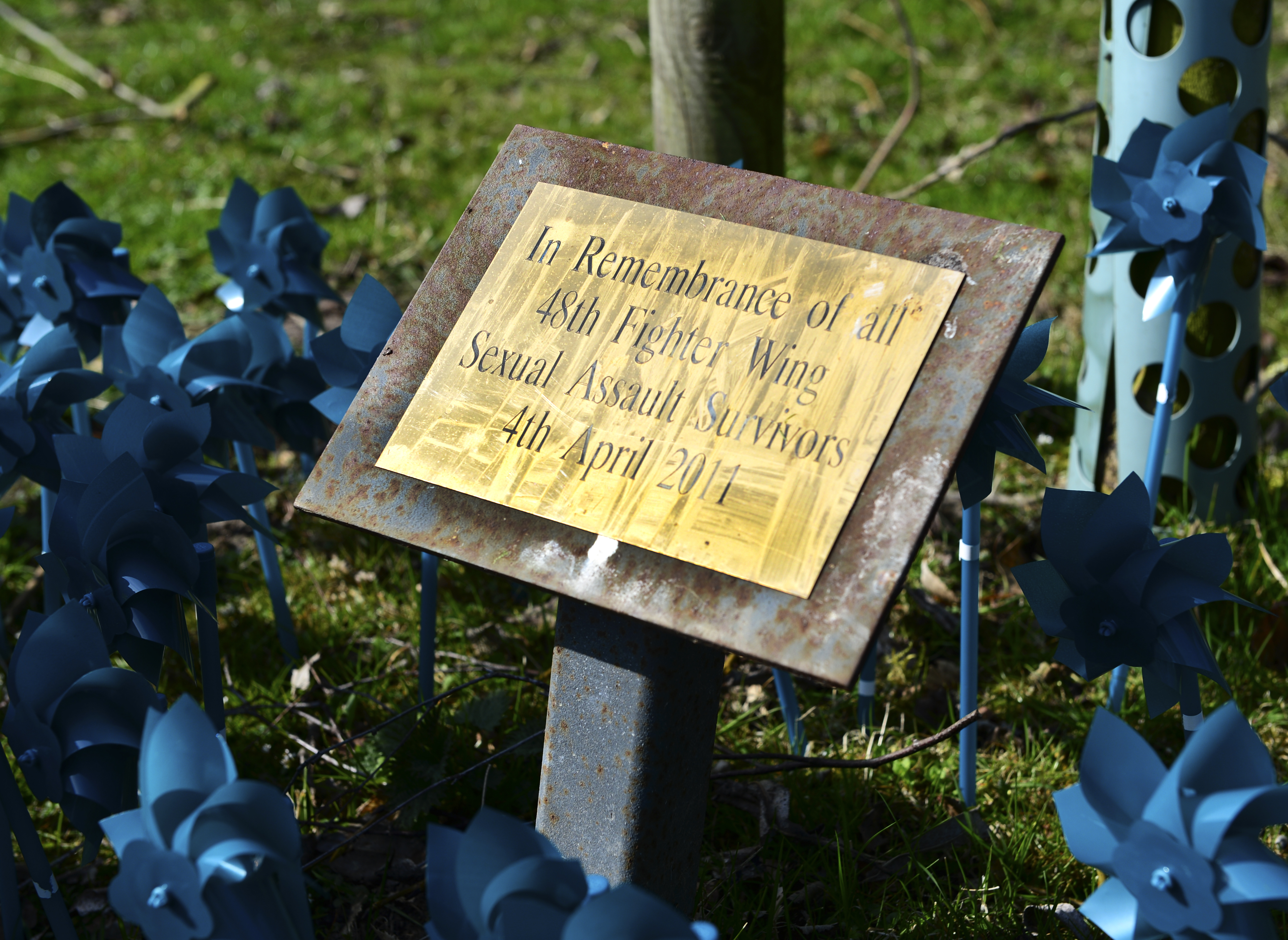 Teal pinwheels were placed at the duck pond on Royal Air Force Lakenheath, England, April 10, 2015 to commemorate survivors of sexual assault from the past three years. Throughout the month of April, the Sexual Assault Prevention and Response and the Family Advocacy office will hold numerous events including Handbag Bingo and a ‘Stop the Violence’ Fitness Challenge, to celebrate Sexual Assault and Child Abuse Awareness Month. (U.S. Air Force photo by Airman 1st Class Dawn M. Weber/Released)