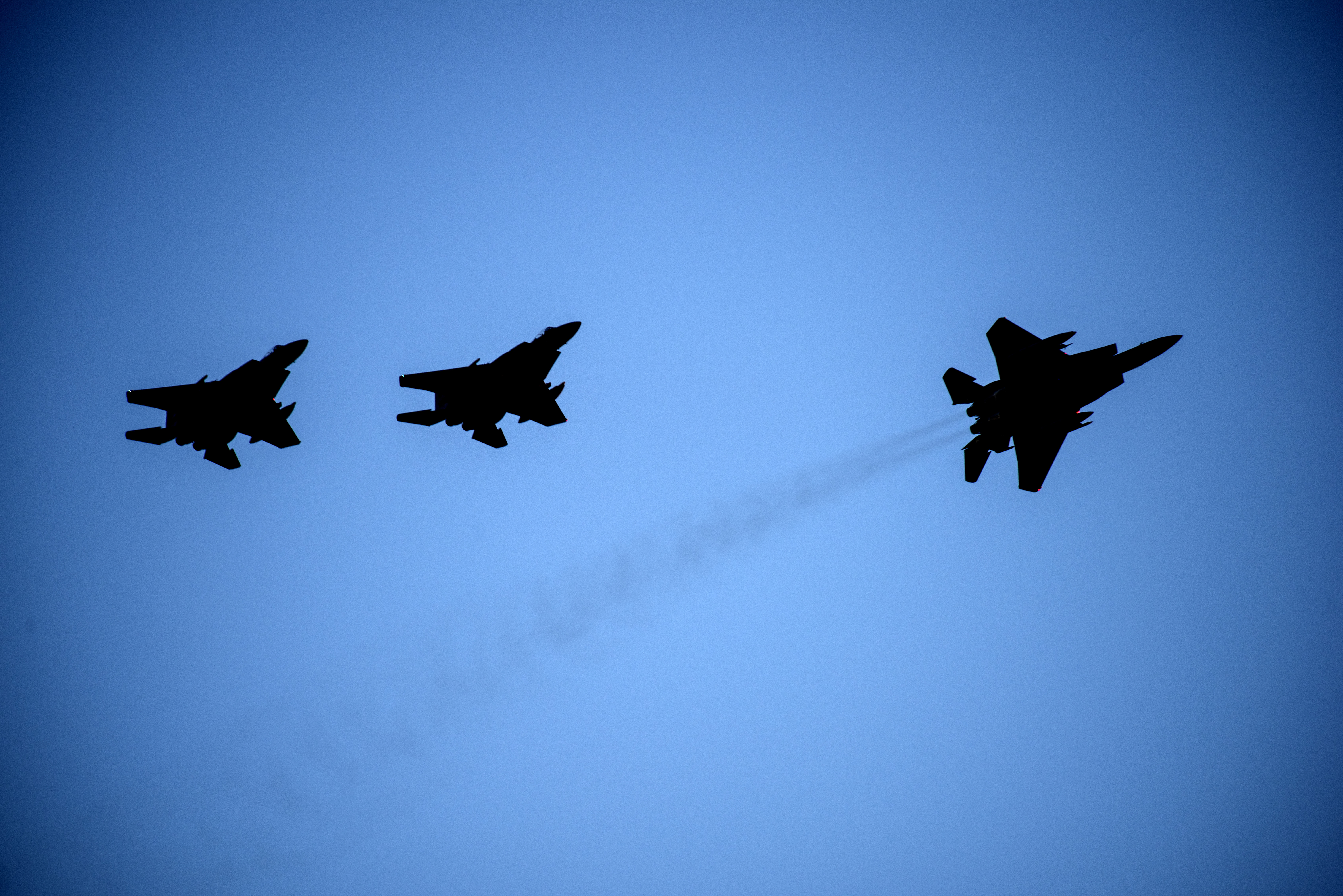 F-15C Eagles assigned to the 493rd Fighter Squadron fly over Amendola Air Base, Italy, Nov. 16, 2018. F-15C Eagles and an F-15D Eagle will be participating in the NATO Tactical Leadership Programme 18-4. This event marks the first time the course has been held in Italy, from its normal host location at Albacete Air Base, Spain. (U.S. Air Force photo/ Senior Airman Malcolm Mayfield)